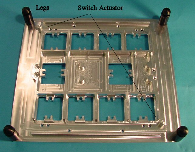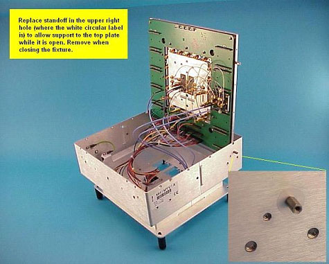 6) The two standoffs (MGZ88J1A) are used as a lever arm and support when the fixture is in the open position. In order to close the fixture, remove the support standoff and then lower the top plate by the lever-arm. After closing the fixture, the support standoff can be returned to the same hole location from which it was removed.