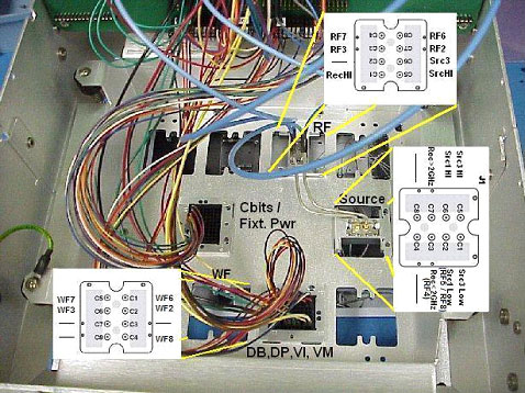 7) Attach the DC harness blocks (GGGHA02A) with 4-40 x 3/16” screws (MC7SVE1A) and a little bit of LOCTITE to the bottom plate. Also attach RF blocks (RIK0103A) using the same screws (MC7SVE1A) and add cables to suit your configuration (Refer to "Bottom Plate Assembly Resources - Cassini" for different configurations).