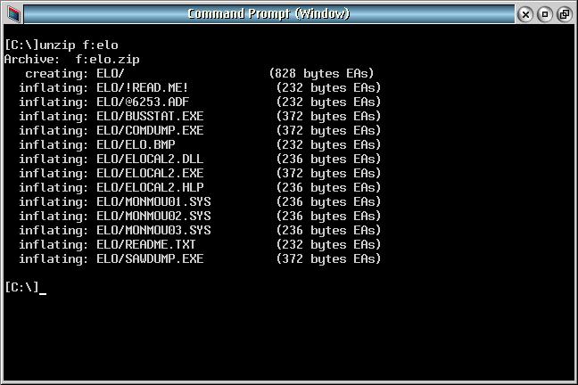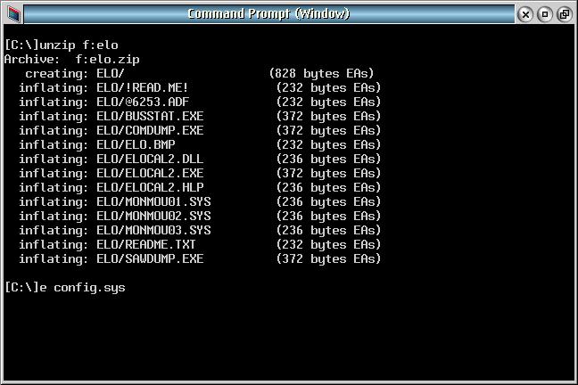 open an OS/2 command window and type "unzip f:elo", as shown here